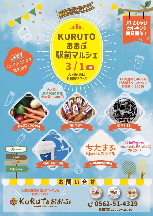 474-0025 愛知県大府市中央町三丁目278番地(JR大府駅構内) [ カフェ ] 0562-77-4197 [ 物 産 ] 0562-51-4329